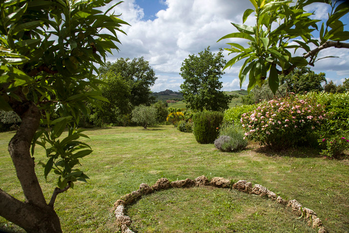 THE GARDEN: Sprawling wide beautiful green lawn with olive and pomegranate trees in front of the proeprty with an amazing view over the rolling Sienese hills.