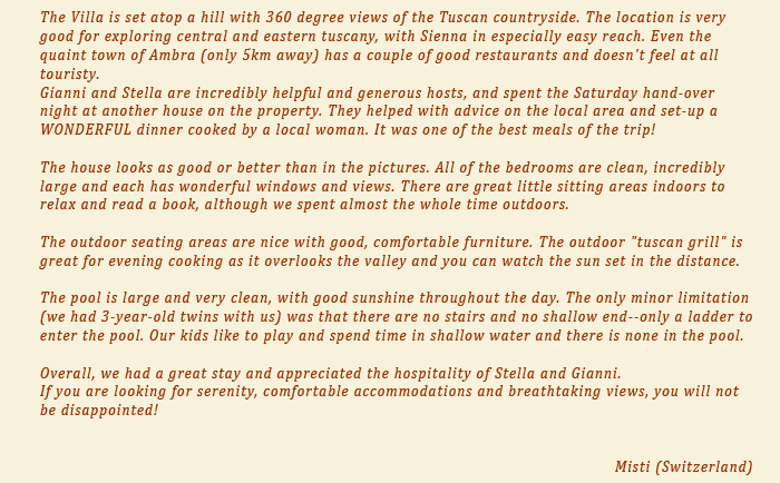 This beautiful Tuscany villa close to Siena and Florence accommodates up to 10 people and boasts 5 bedrooms, 3 living rooms with fireplaces, 3 bathrooms and 1 additional WC, a fully equipped kitchen, indoor + outdoor dining areas and a private swimming pool (10x5) in the large garden.