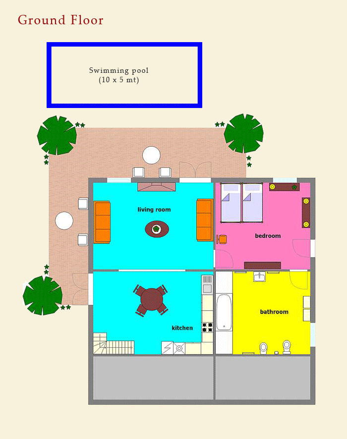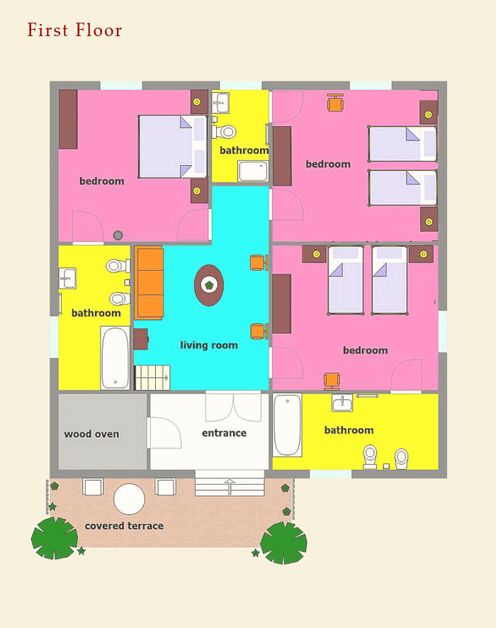 FIRST FLOOR: Front porch entrance, living room with an internal staircase leading to the kitchen, 1 double room and 2 twin rooms (the beds can be joined to make a qeen bed) . All bedrooms have their bathroom ensuite (2 with bath, 1 with shower).