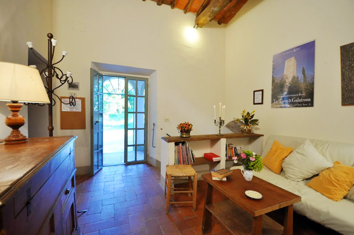 The farmhouse (Guests 8 - 130 sqm / 1170 sqft) is on a hillside just below the Tower of Galatrona, symbol of the whole property. Surrounded by chestnuts and oaks, from the house you can enjoy a sweeping view of the Valdarno valley.