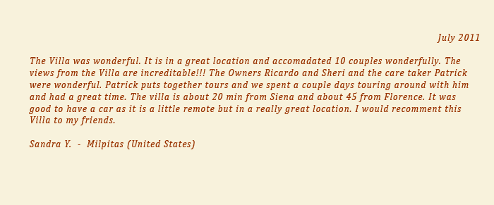 The Villa stands on the top of a hill at the far south east end of the Chianti hills, in Valdambra a place that has amazingly preserved the beauty and genuine aspects of its land. Montebenichi (3 km) is a nice small village, halfway between Arezzo and Siena.