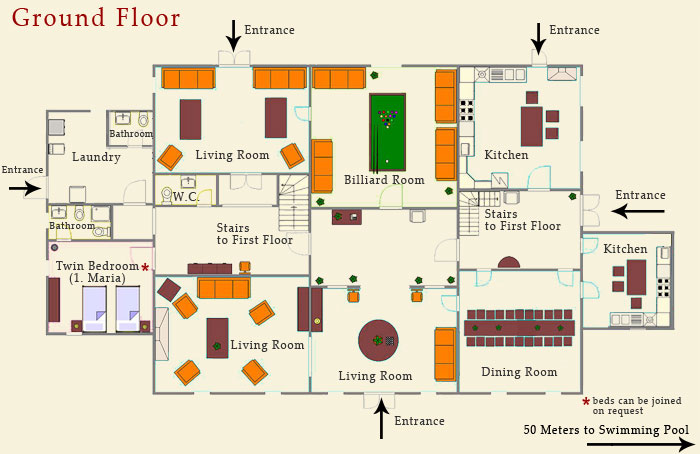 : 14 sleeps in 7 bedrooms with 6 bathrooms, 2 kitchens and private swimming pool