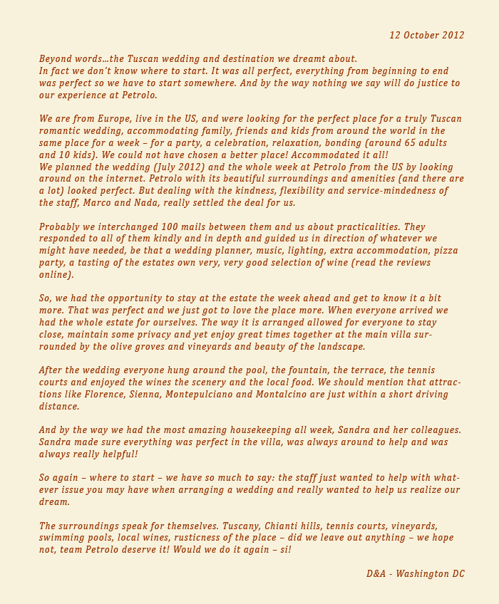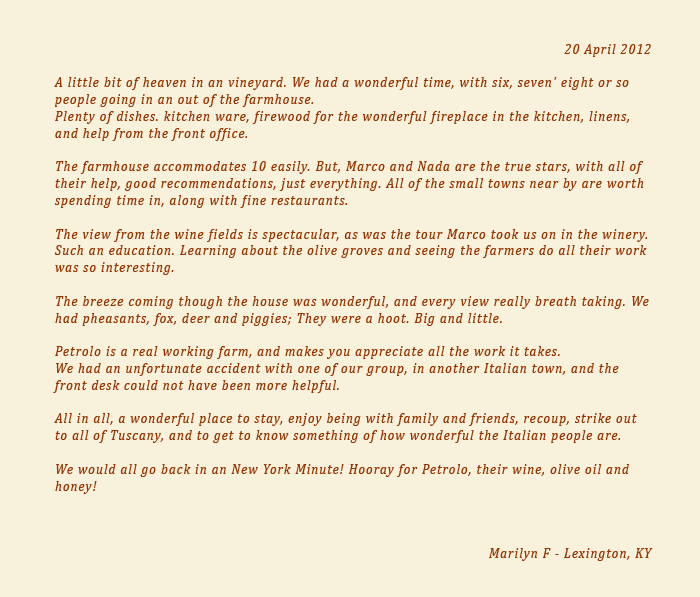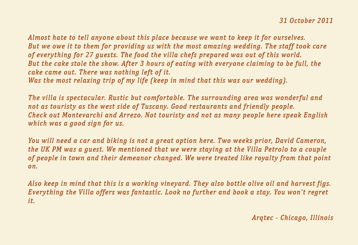 Guests can rent one or more villas; this page show only the info and photos about the main villa "Villa Petrolo", please scrool down for a view of the entire estate or check on Google Maps |