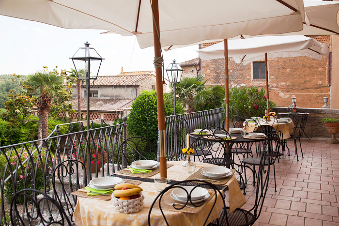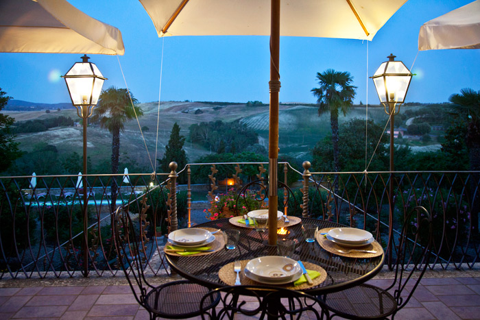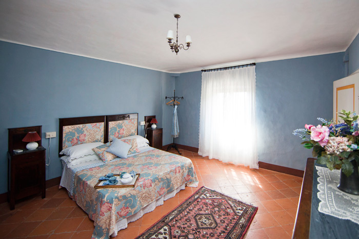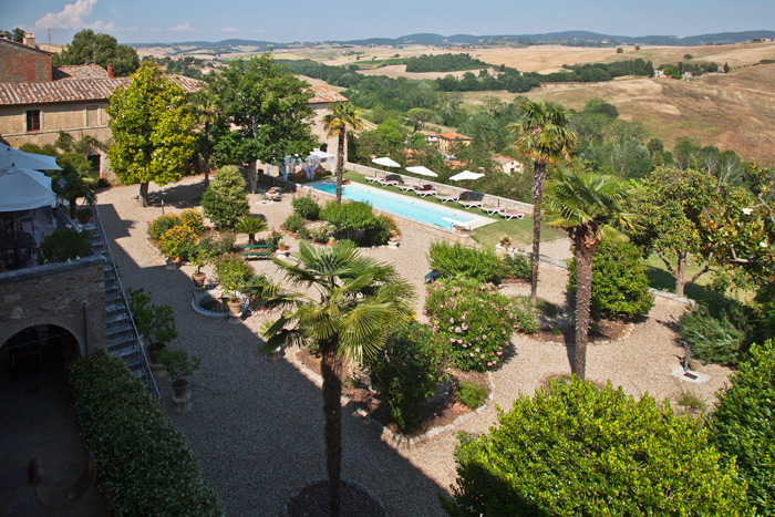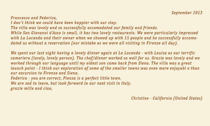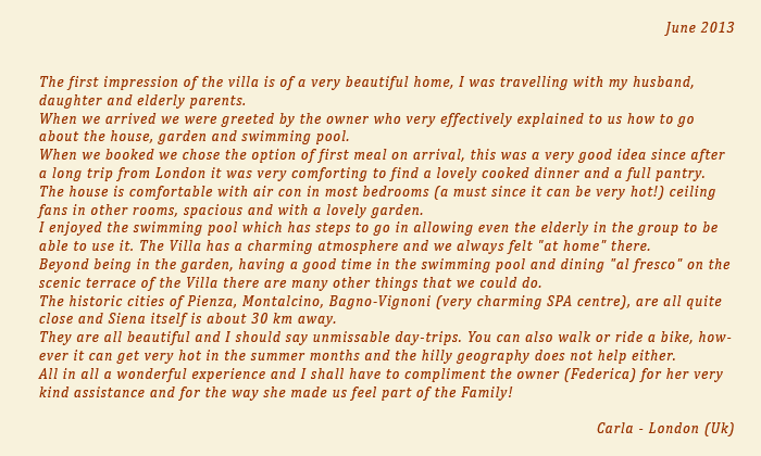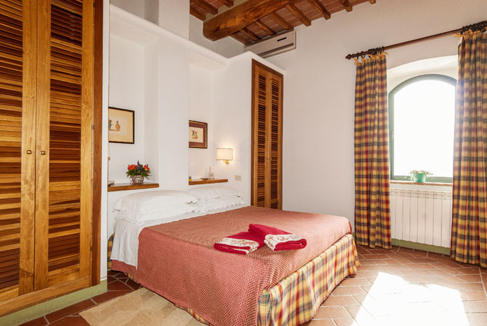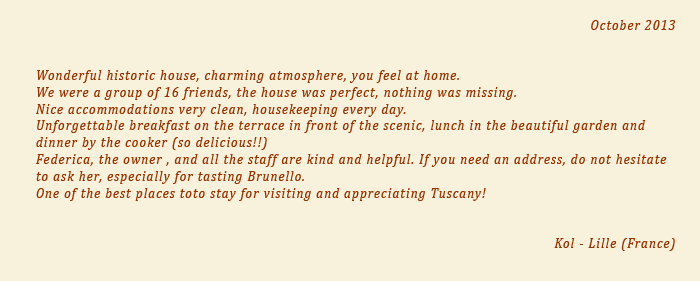 It is situated opposite the castle and has a large, sunny terrace and a wide garden, with a private swimming-pool, overlooking the spectacular Tuscan countryside.