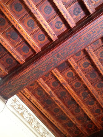 Starting from the beautiful sitting room with fireplace and wood ceiling you can reach a